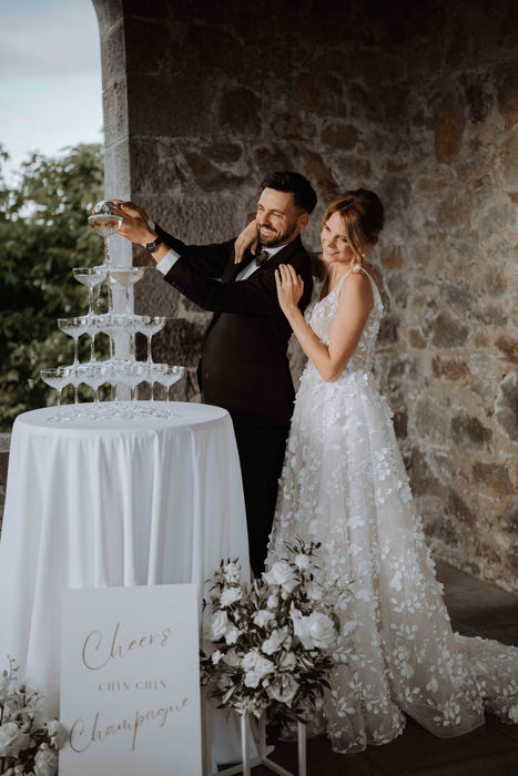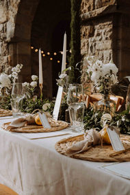 Die Gäste wurden von einem leichten Hauch von Lavendel und Oliven empfangen, der die Luft mit seinem betörenden Duft erfüllte. Auf elegant gedeckten Tischen thronten Kerzenleuchter, umhüllt von duftenden Blumenarrangements in warmen, erdigen Farbtönen. Ein rustikales, aber dennoch romantisches Ambiente wurde geschaffen, das perfekt zum toskanischen Flair passte.